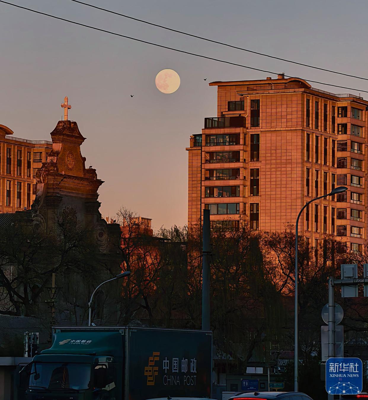 ↑ 12月4日在北京宣武门附近拍摄的月亮。新华社记者 邢广利 摄