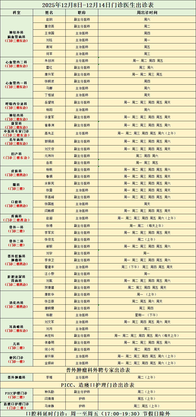 温馨提示:1、门诊上班时间:上午8:00-12:00 下午14:00-17:00周日及法定节假日上午8:30上班2、医保科节假日正常上班。3、医师出诊时间如遇变动,以当日安排为准,敬请谅解。4、就诊时请携带有效证件。