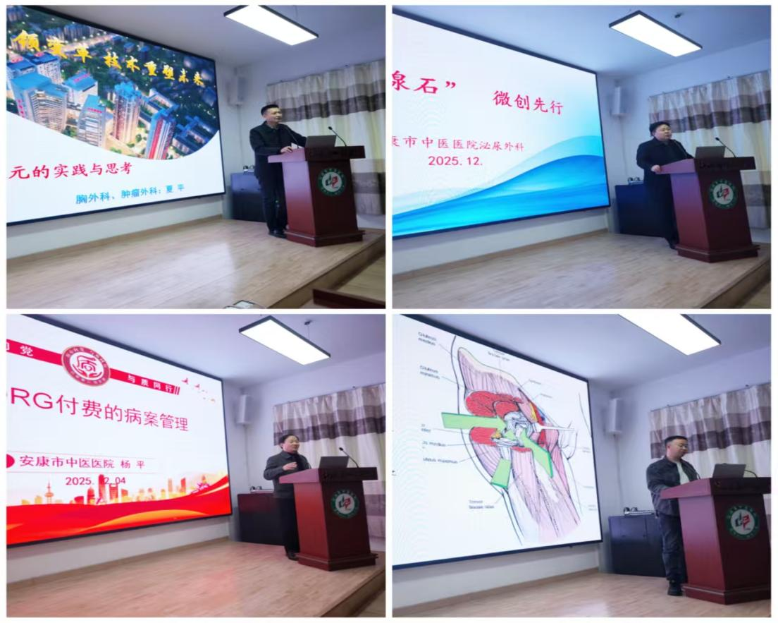 在学术培训与现场交流环节,活动采取“分组并行”模式。学术培训会上,安康市中医医院夏平主任、肖尚文主任、杨平主任、汉滨区中医医院晏显锋主任分别就胸外肿瘤微创技术发展、泌尿外科微创实践、DRG支付下的病案管理及DAA在老年人工关节置换术中的应用作了专题分享,观点前沿,启迪思考。