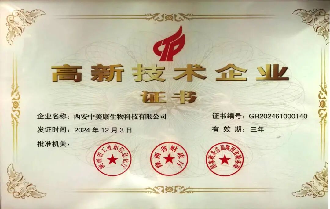 2024年,凭借突出的研发能力与产业化成果,中美康生物成功斩获“高新技术企业”资质,这不仅是对公司科创实力的官方认可,更标志着其在大健康领域的技术壁垒进一步筑牢。