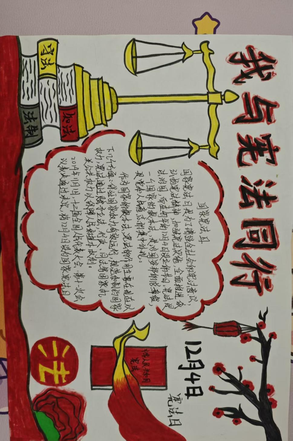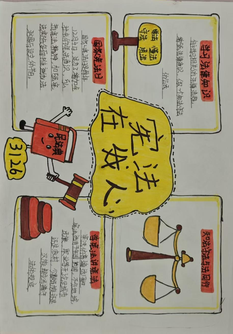 随后,各班还展开了丰富多彩的自主实践活动。有的班级绘制了宣传宪法的手抄报;有的班级围绕宪法主题开展主题班会;还有班级将宪法教育融入艺术创作与实践活动。在音乐课上,共唱《宪法伴我们成长》,朗朗上口的旋律让法治观念随歌声传递。