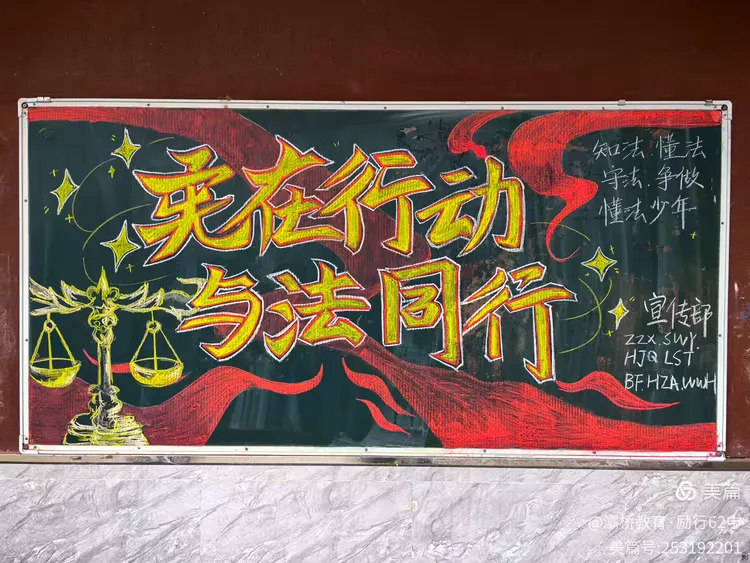1、“宪在行动,与法同行”主题黑板报宣传活动(12月3日)为营造浓厚的宪法学习氛围,学校于12月3日组织各班级精心制作了以“宪在行动,与法同行”为主题的宪法宣传黑板报。各班积极响应,同学们充分发挥创造力,通过图文并茂的形式,生动形象地展示了宪法的地位、作用以及公民的基本权利和义务等核心内容。黑板报主题鲜明、内容丰富、设计新颖,成为校园内一道亮丽的法治风景线,有效普及了宪法知识,增强了同学们的宪法意识和法治观念,让宪法精神在校园内广泛传播。