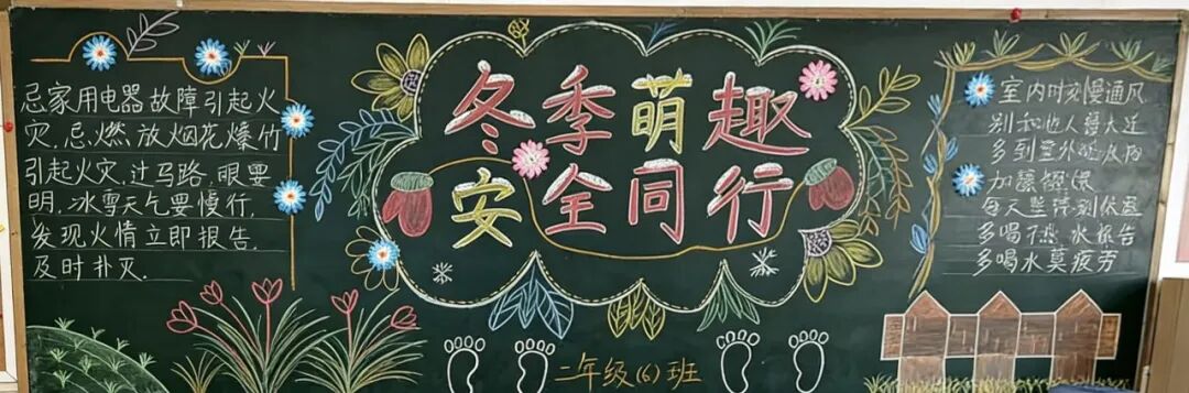 二年级各班站在儿童视角,以富有趣味的形式利用黑板报普及冬季安全知识,增强学生的自我防护意识,守护冬季校园安全。版面以萌系卡通形象为主角,分板块呈现冬季交通安全、防火防滑、防寒保暖、卫生保健等内容,搭配安全儿歌、趣味漫画与简易提示语,图文结合直观易懂,既保持画面萌趣感,又让安全知识深入人心,助力学生平安度过冬季。