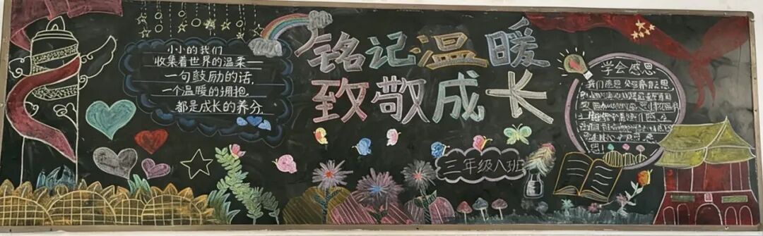 三年级黑板报主题聚焦国际志愿者日,意在引导学生感悟互助力量,传递暖心正能量,培养感恩与奉献意识。创作中收录学生身边的互助小故事,搭配志愿者精神科普与暖心标语,版面以暖色调为主,穿插手绘暖心元素,整体风格温馨治愈,让学生在感知温暖中学会关爱他人、向阳成长。