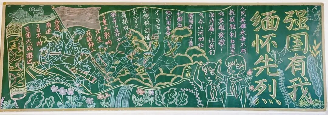 五年级各班的版面创作契合国家公祭日主题,意在引导学生铭记历史、缅怀先烈,传承红色基因,激发爱国情怀与责任担当。版面语言字里行间透着凝重的基调,搭配家国情怀主题标语与人民英雄纪念碑等元素,庄重肃穆又不失感染力,穿插学生原创的致敬感言与红色感悟,让学生在回望历史中坚定理想信念,树立强国有我的远大志向。