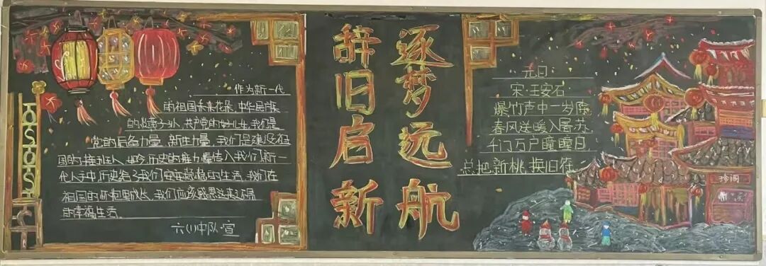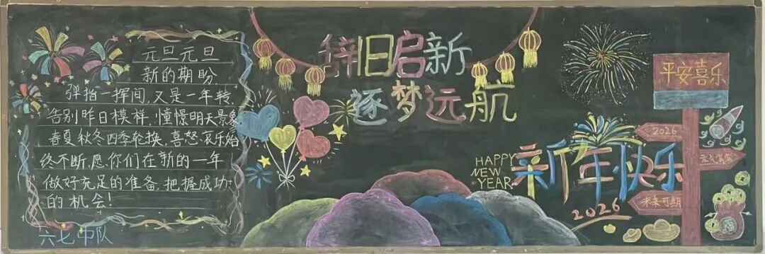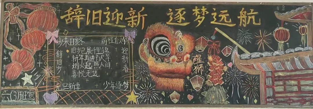 六年级各班充分利用黑板报这一宣传阵地,回顾过往的成长历程,展望新年的美好愿景,激励学生们以昂扬的姿态奔赴新的征程。版面设计巧妙融合新年、元旦等传统习俗元素,展示学生的成长心愿与未来期许,搭配象征希望与未来的图案,文字兼具诗意与力量,整体风格大气且励志。这不仅传递了辞旧迎新的喜悦,更为六年级学生的校园时光注入了逐梦前行的动力。