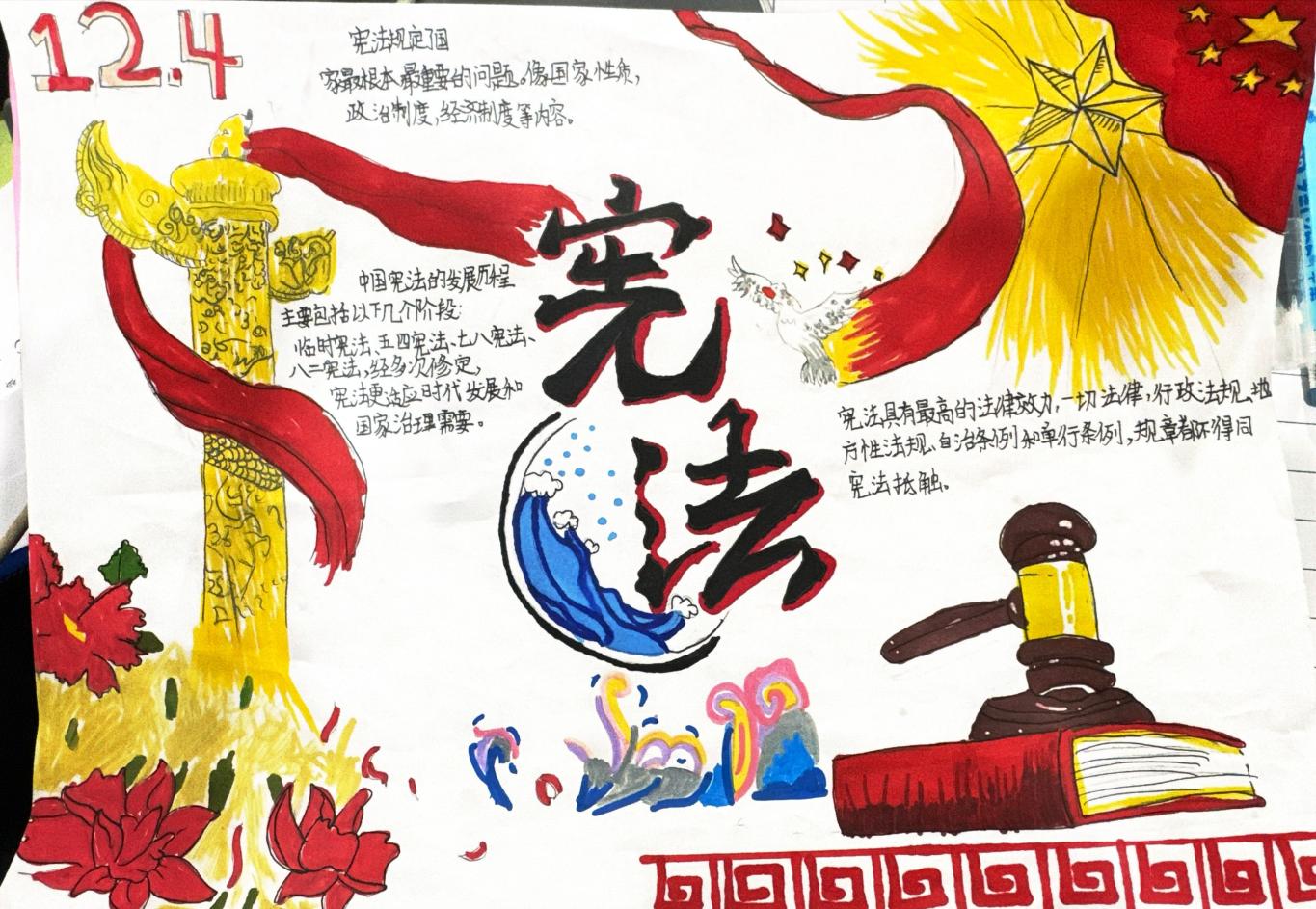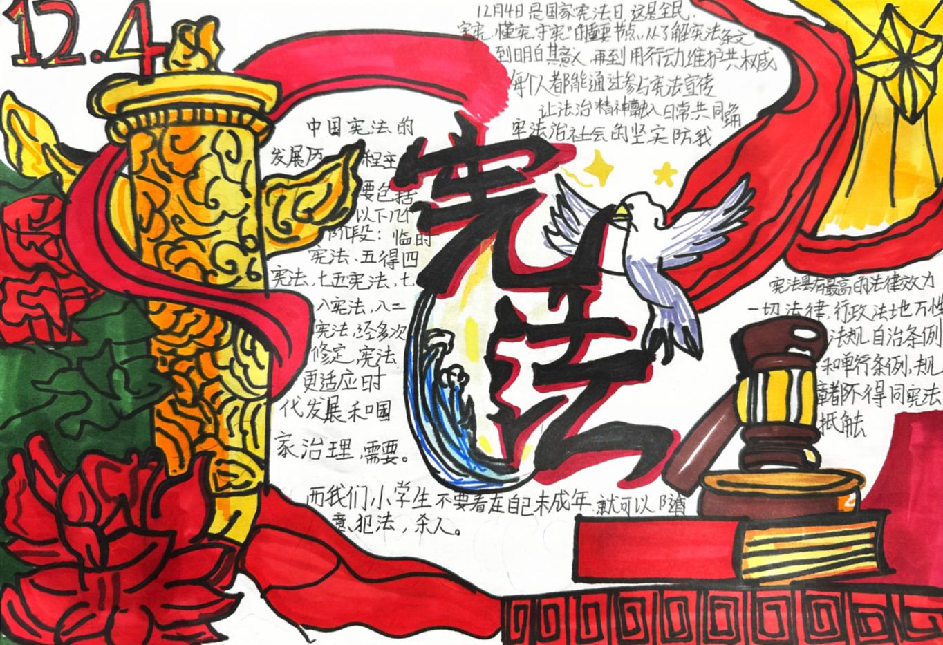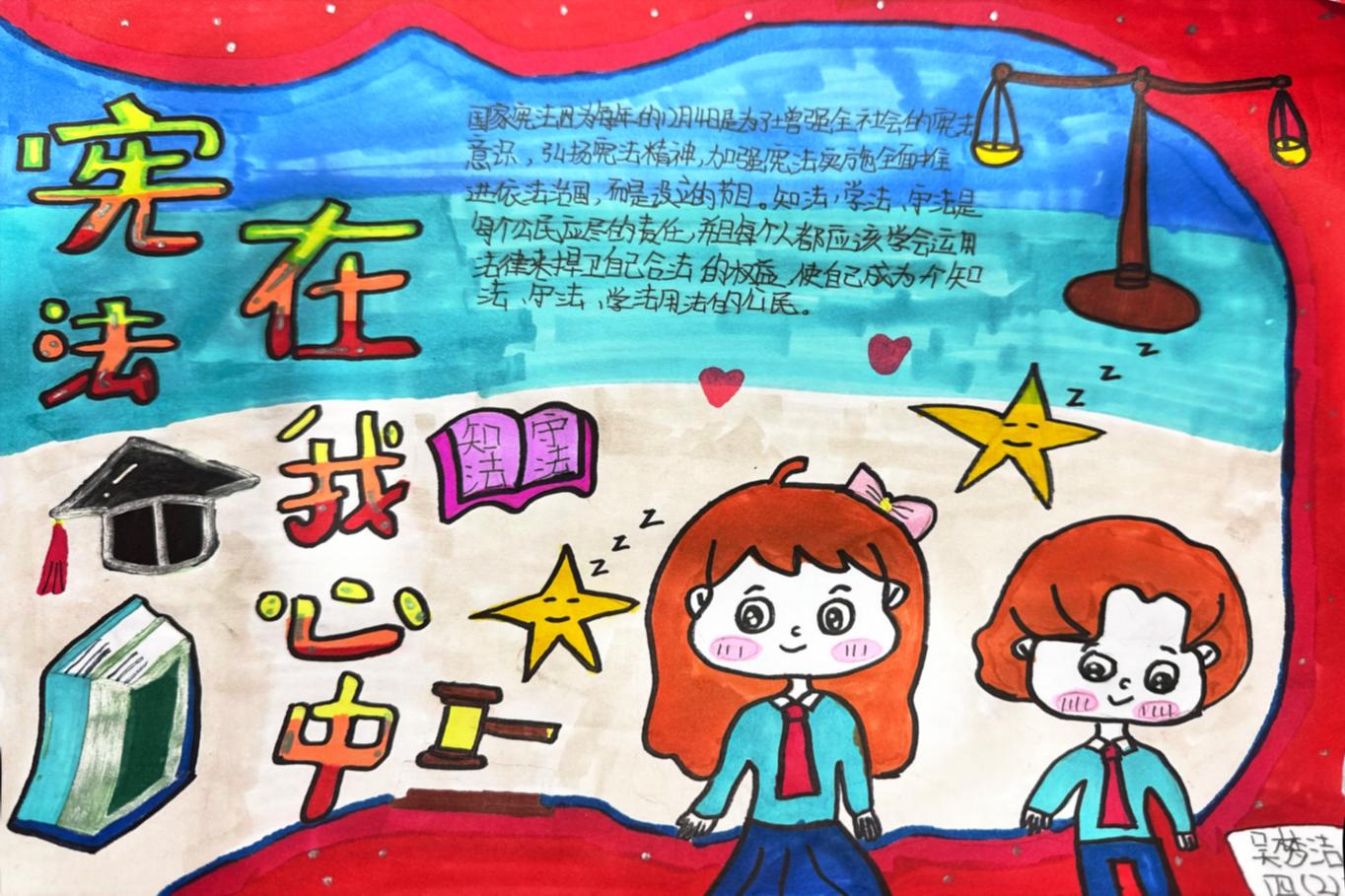 在班级的组织下,学生们围绕宪法主题查阅资料、构思版面,用画笔和文字精心绘制手抄报,图文并茂地展现对宪法条文与法治精神的深刻理解。