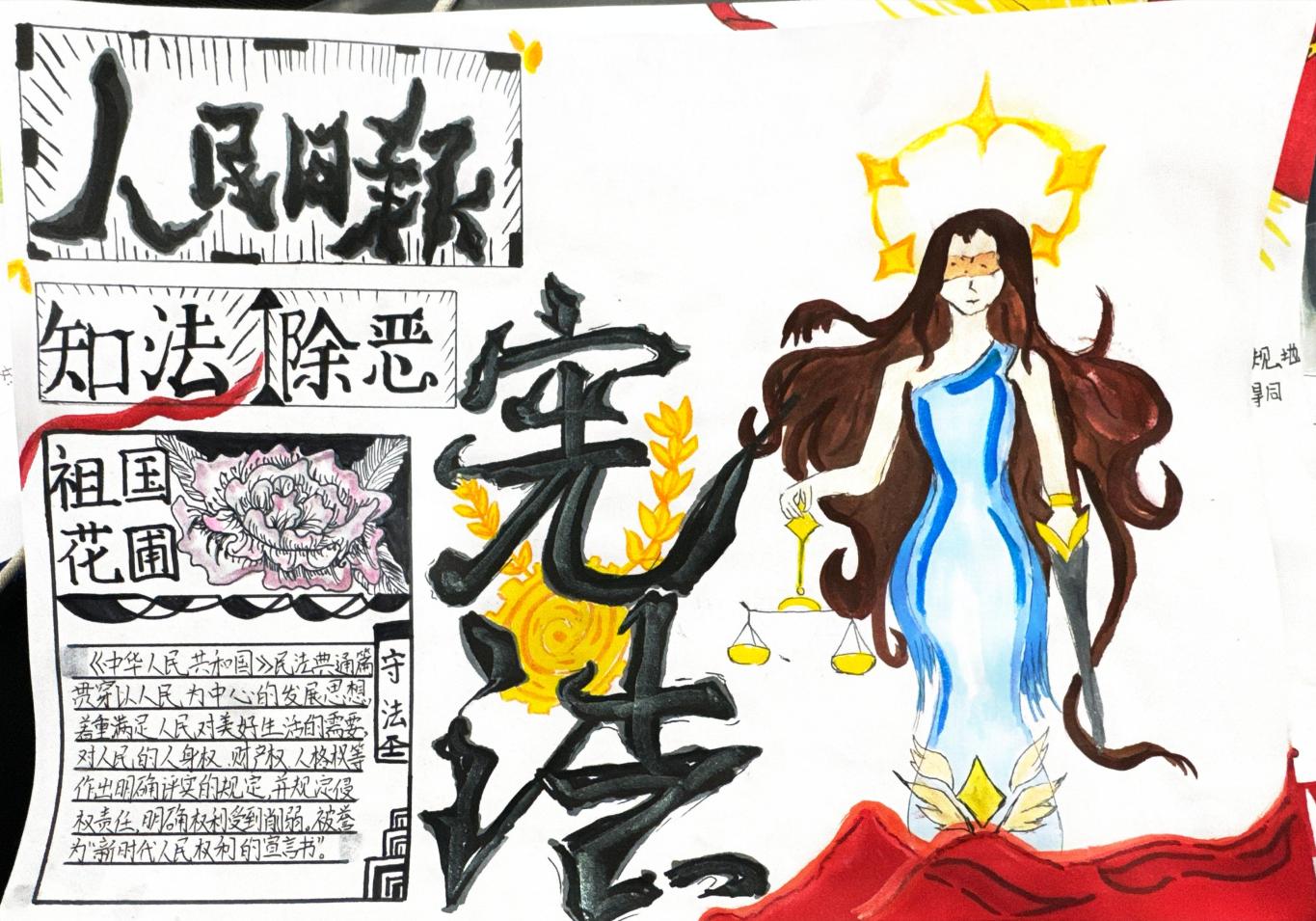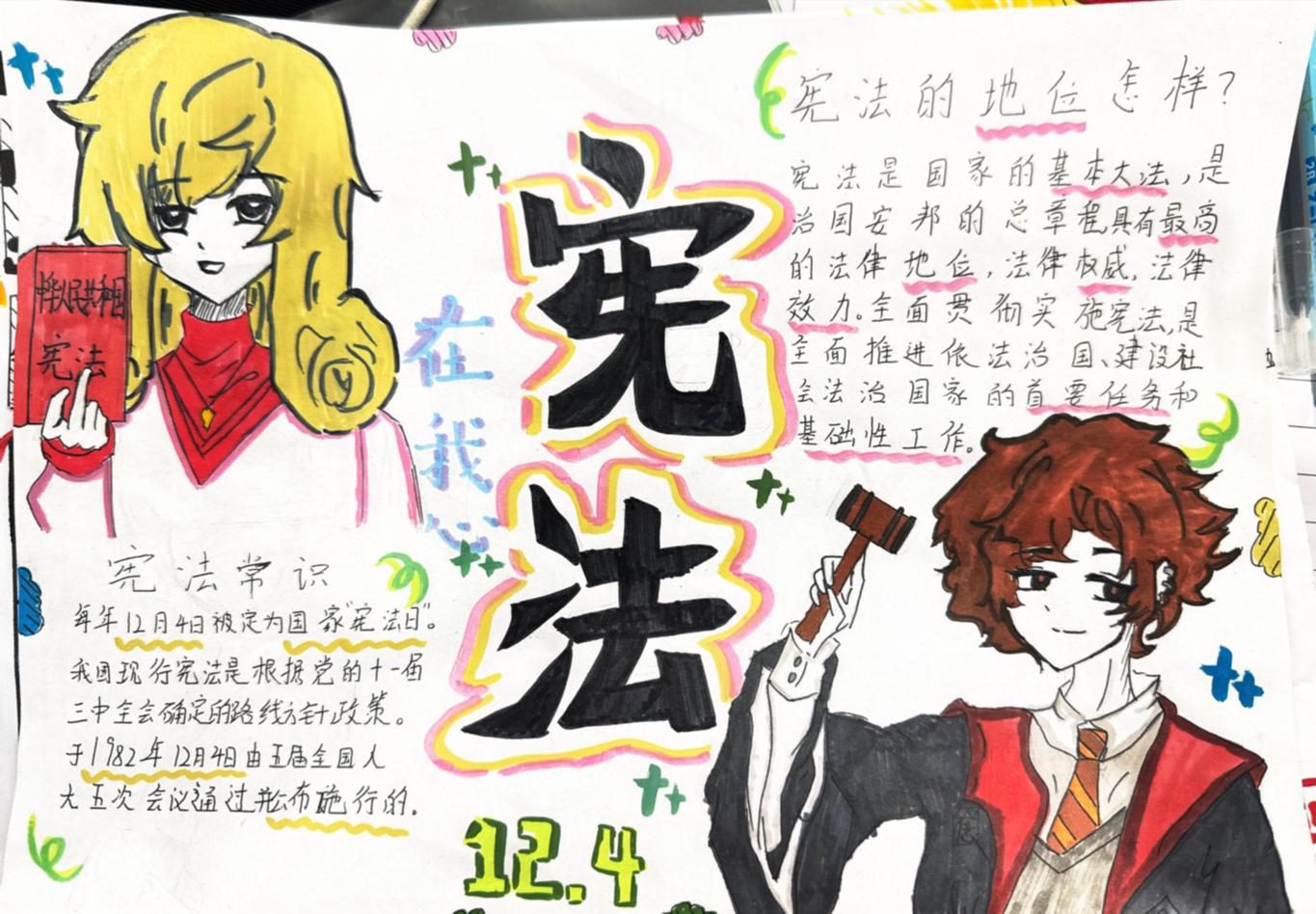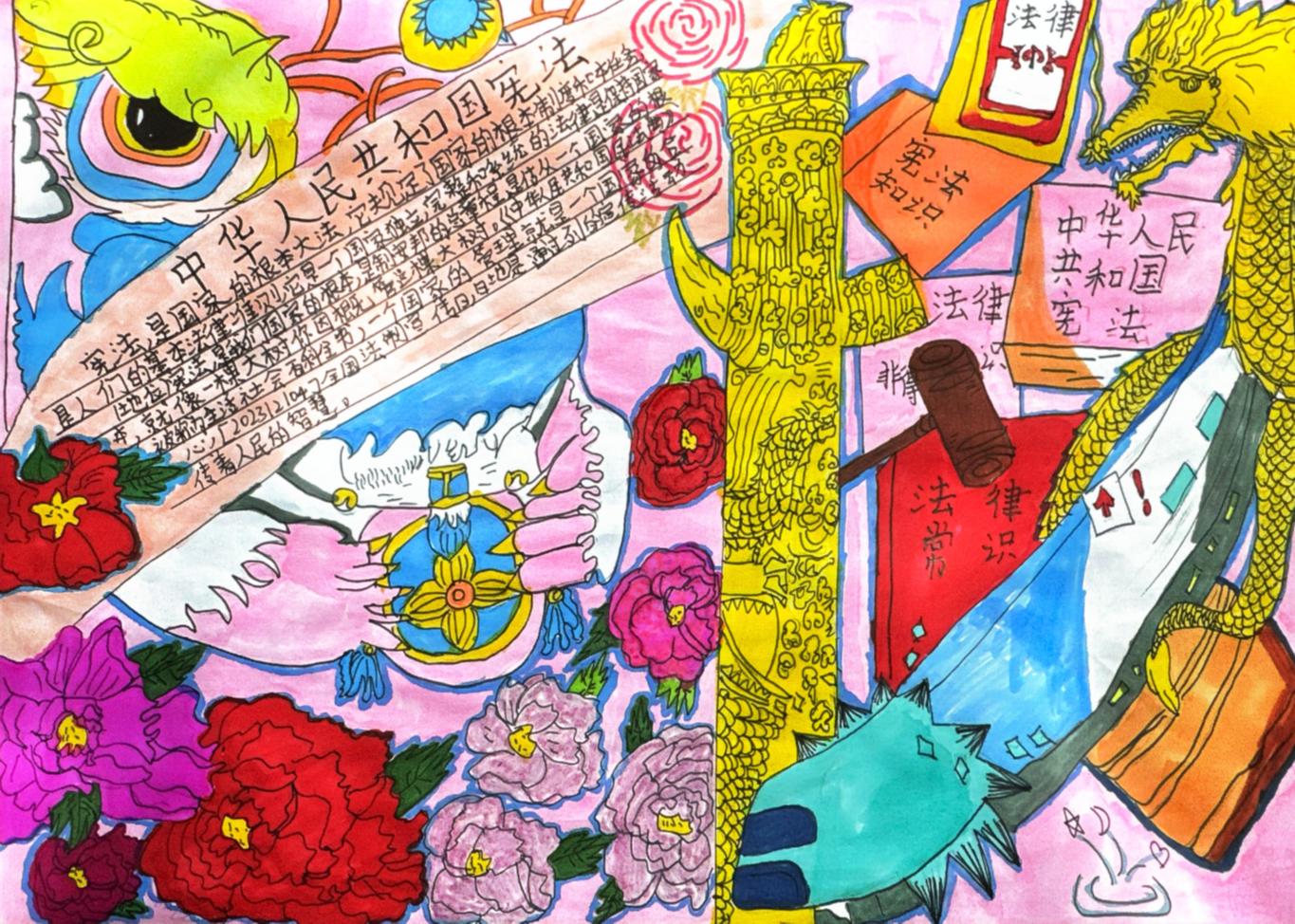 在班级的组织下,学生们围绕宪法主题查阅资料、构思版面,用画笔和文字精心绘制手抄报,图文并茂地展现对宪法条文与法治精神的深刻理解。