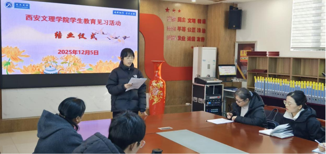 12月1日上午,见习活动的开班仪式在五环中学党建活动室隆重举行。校党总支书记郑红科、校长张丽茜对学员们的到来表示热烈欢迎,并强调:“教育见习是‘师范生向教师角色转变的关键一步’,期待同学们在真实的教育场景中‘观察、思考、交流、成长’。”西安文理学院历史教育系主任王筱宁在讲话中勉励学员珍惜机会,主动学习,在实践中学真知、悟真谛、练真功。学员代表——班长吴怡静表示,定不负学校期望,把握好这次难得的见习机会,认真虚心观摩学习,做到理论联系实际,服从学校管理,争取最大收获。