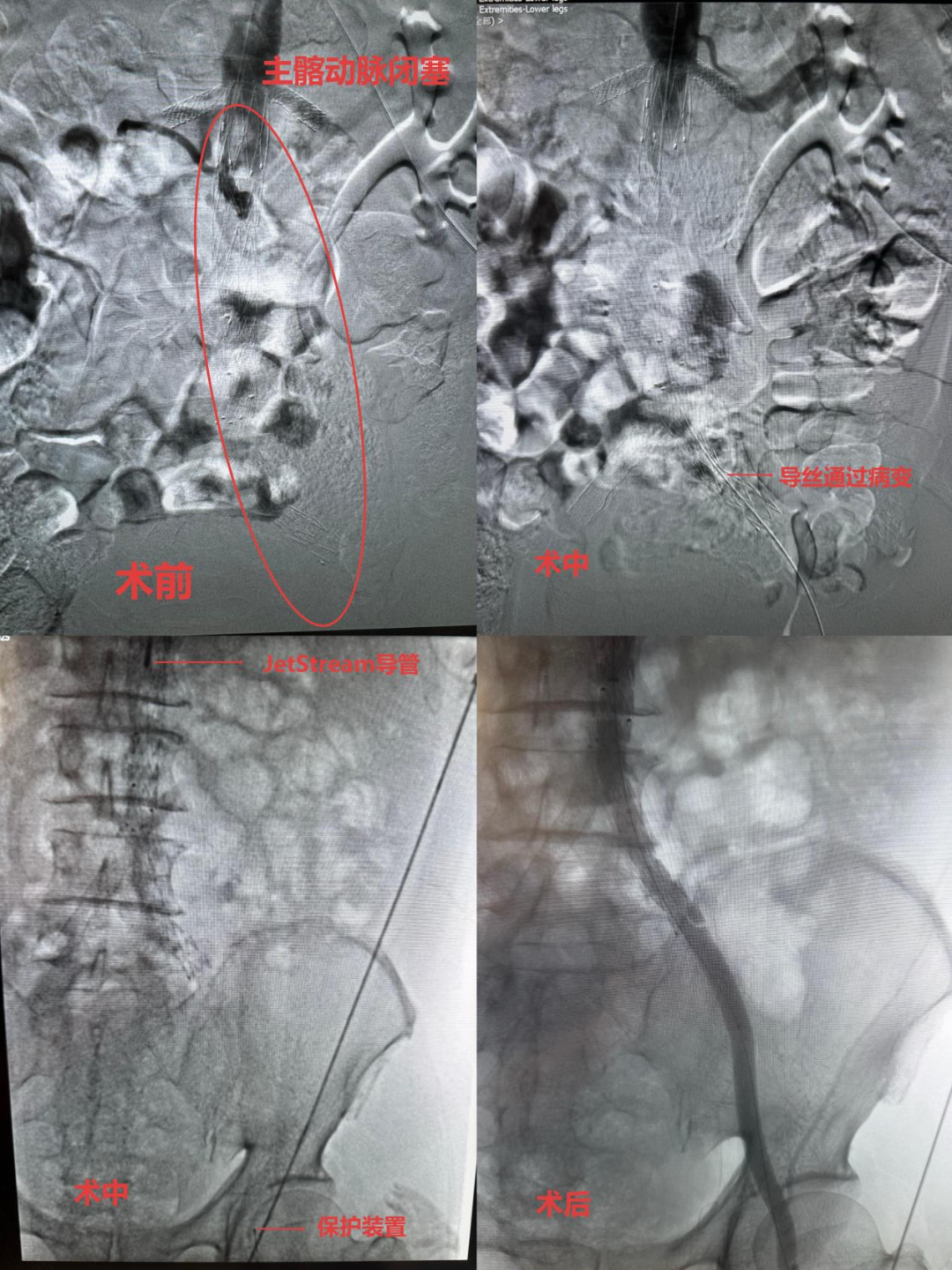 该院血管介入科手术团队(马磊主任、王程阳副主任医师、李轶主治医师),反复研究术前影像与病变特点,经过充分的术前讨论和评估,决定经肱动脉入路在保护装置加持下采用最新的机械旋切抽吸(JetStream)技术施治,该技术已应用于下肢动脉病变治疗,但经肱动脉路径治疗主—髂动脉闭塞为首次运用,既规避常规入路局限,又契合患者微创需求。