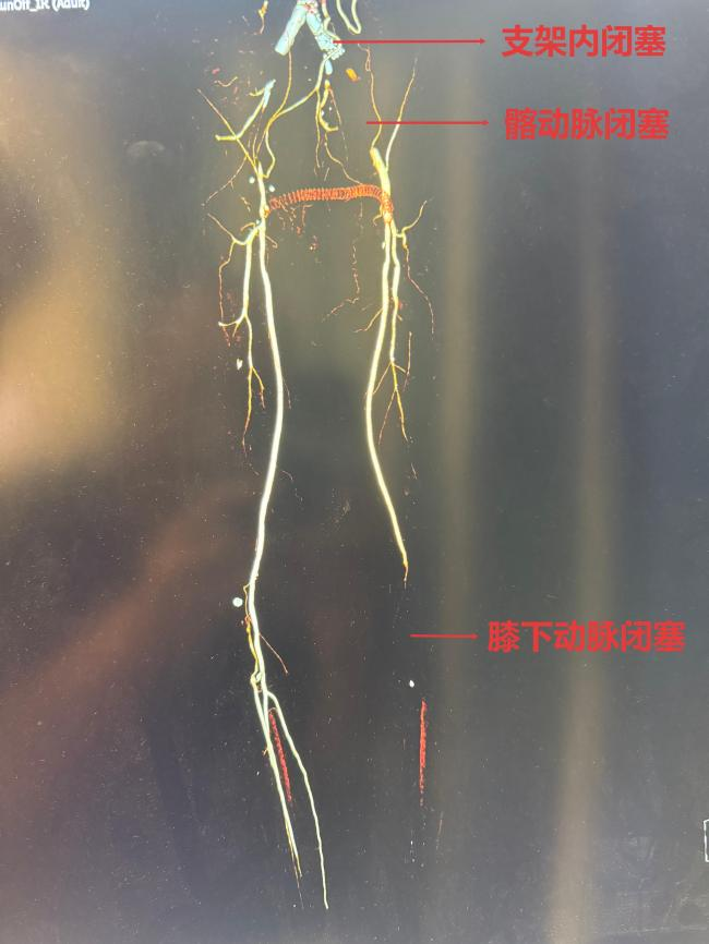 经CTA检查确诊患者为腹主动脉下段及双髂总动脉支架内闭塞,双髂外动脉起始段闭塞,左侧膝下动脉均为显影(考虑闭塞)。患者此前经过两次手术后,形成长段血管闭塞,常规治疗入路不可行,且抵触再次开放手术,左下肢可能面临截肢风险,生命受严重威胁。