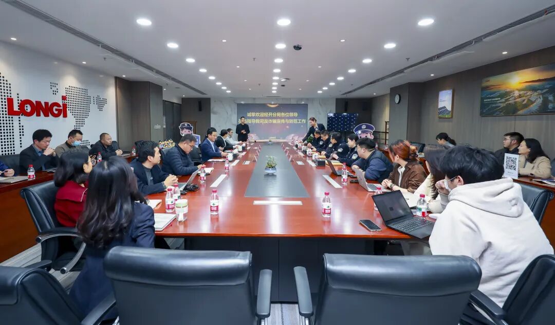 活动以“参观+宣讲+互动”多元形式展开。在企业参观环节,与会人员在讲解员的引导下走进隆基智慧能源展馆,深入了解企业发展历程、核心业务及在绿色能源领域的创新成果。随后的业务交流座谈会上,分局副局长张权与隆基集团人力资源管理中心负责人马福海分别发言,围绕电信网络诈骗防范、企业运营与员工生活中的风险点展开深入探讨,共同完善警企联防机制。