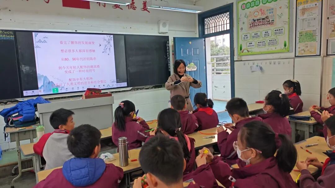 五三班李若冰妈妈带领同学们领略配饰里的文化乾坤。课堂上,大家认识了古代腰饰家族:带钩作为“豪华皮带扣”,曾救齐桓公性命;玉佩是君子的“品德徽章”,承载着古人的德行追求;佩剑是身份象征的“百兵之君”;蹀躞带则是多功能“古代工具腰带”。同时还了解了荷包、香囊的浪漫寓意,对比80、90年代钥匙串与现代潮流配饰的变迁,最后还指导同学们动手制作了简单的配饰,让大家在动手实践中感受传统文化的深厚底蕴。学生们用毛线创作出专属的小挂件,在趣味盎然的过程中感受配饰的文化底蕴与创意魅力。