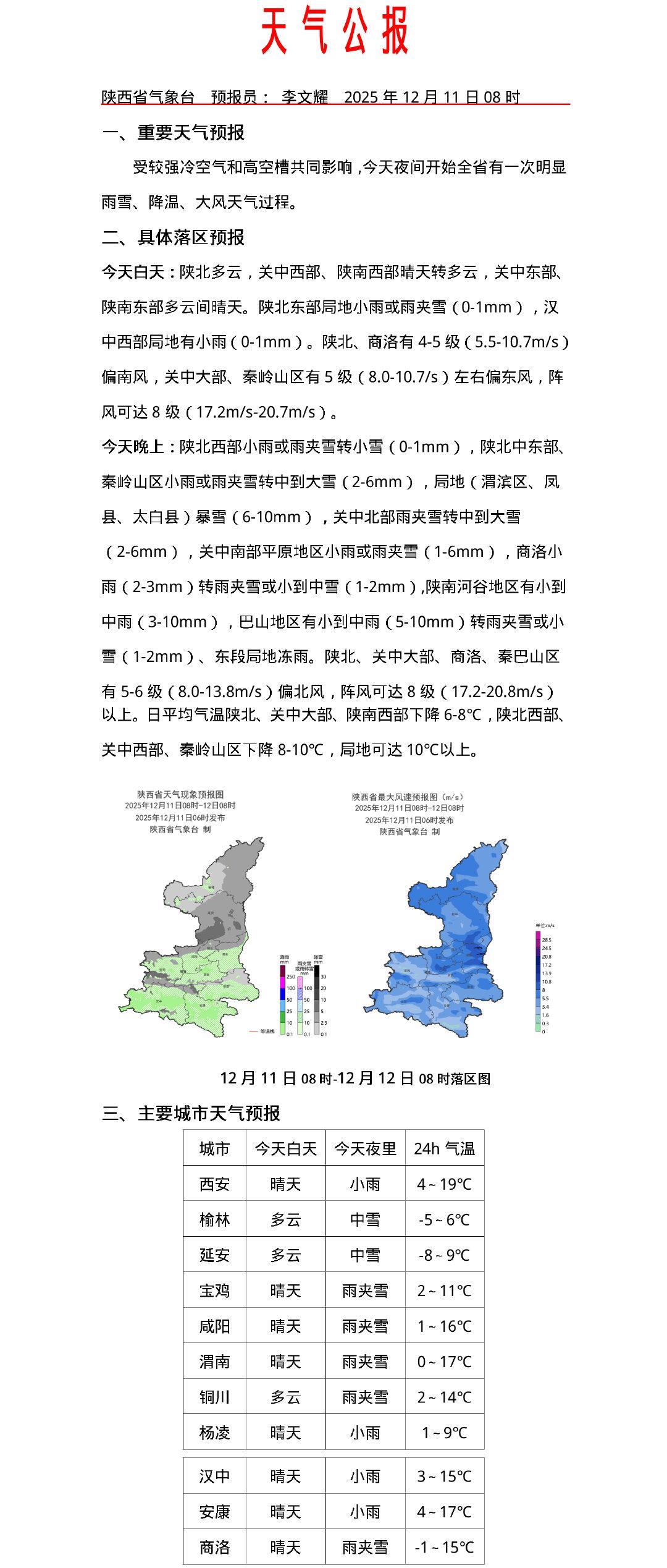今天晚上:城区及平原地区小雨或雨夹雪,秦岭山区小雨或雨夹雪转小到中雪,局地大雪。