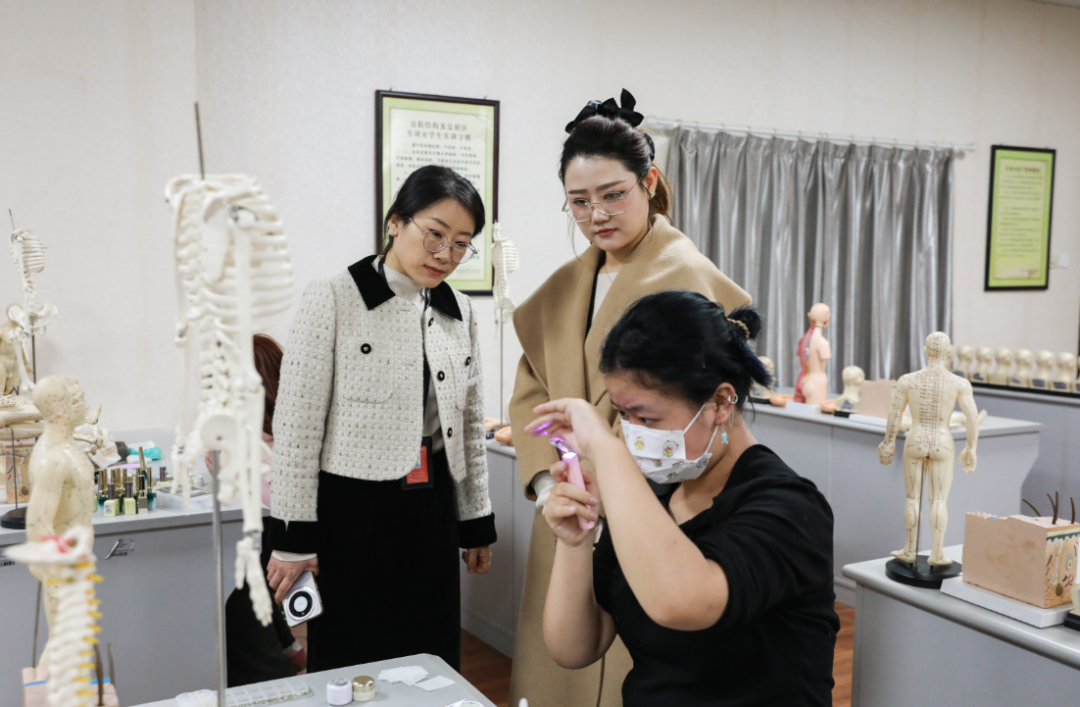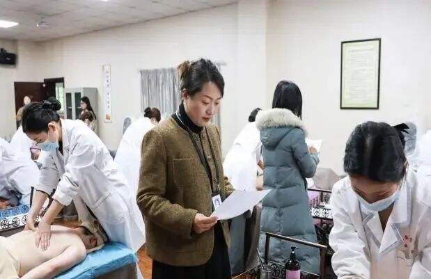 比赛当日,学院教务处范红处长、医学美容系郁昱主任,及医美系教学科安婉婷科长、学生科童宁科长深入各实训赛场巡查指导。在现场,领导团队重点查看面部护理消毒操作规范度、身体护理精油精准调配流程、纹绣项目无菌操作执行情况等关键环节,随后与评委组围绕赛事标准落地、评分细则执行等内容深入交流。同时,系主任郁昱对赛场秩序维护的有序性、安全保障措施的完备性给予充分肯定,并强调:“职业技能大赛是深化‘以赛促教、以赛促学、以赛促练’的核心载体,必须始终紧扣医美行业岗位需求设定竞赛内容,让学生在实战竞技中锤炼职业能力,为行业精准输送兼具专业素养与实操水平的高素质技术技能人才。”
