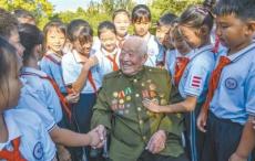 孔宪德敬礼。浙江师范大学附属小学的学生聆听孔宪德讲述战争年代的故事。军装、纪念章、老照片、回忆录……得知一群孩子要来,孔宪德特意交代儿子孔毅把家中的老物件找出来。“多和年轻人交流,才能将红色精神更好传...